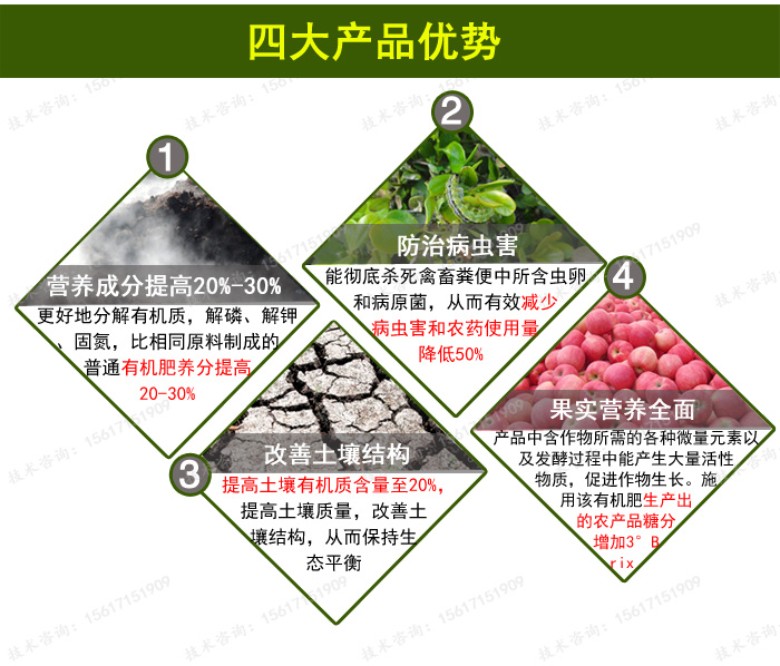 使有农富康有机肥发酵剂发酵羊粪有机肥的简单方法: 步骤一:拌匀发酵剂。2吨干羊粪加一袋有机肥发酵剂,每袋发酵剂加5~10公斤米糠或玉米、麸皮,搅拌均匀后撒入已准备好的物料中,效果佳。 步骤二:调节羊粪水分。发酵有机肥料的过程中,水分含是否适宜非常重要的,不能太高,也不能太低,应保持在40~60%。 步骤三:羊粪建堆。在做发酵堆时不能做的太小太矮,太小会影响发酵,高度一般在1.5米左右,宽度2米左右,长度在2~4米以上的堆发酵效果较好。 步骤四:发酵完成。一般在羊粪堆积48小时后,温度会升至50~60℃,第三天可达65℃以上,在此高温下翻倒佳,正常一周左右可发酵完成,使物料彻底脱臭、发酵腐熟,灭菌虫。 农富康有机肥发酵剂(订购:156-1715-1909)中主要的微生物菌群有芽孢杆菌、丝状真菌、酵母菌、放线菌、化细菌等,这些有益微生物菌群在生长过程中代谢物相互利用,协同工作,能够快速将 羊粪发酵腐熟成有机肥。羊粪经农富康有机肥发酵剂发酵之后,肥效更好,使用更安便,还可提高化肥利用率等。不仅羊粪可以发酵有机肥,各种动物粪便、秸秆、落叶垃圾、树皮、锯末等均可发酵有机肥,发酵方法本一样。后还要提醒大家,无论用什么物料发酵有机肥,都要把握好水分含,否则会功亏一篑。 农富康有机肥发酵剂-------订购热线:15617151909(王) QQ:1183135824 技术网址: 相比较市面上销售的粪便有机肥,农富康有机肥发酵剂发酵的有机肥更具有含菌高,有机含纯正,没有任何杂物掺杂,更有利于被土壤和植物吸收利用,同时,农富康 有机肥发酵剂发酵羊粪做成的有机肥又能改良土壤性状,降解残和预防土壤板结。 农富康产品购买渠道 1.前往农富康公司提货:郑州市金水区花园路159号(与北环路交叉口向东200米路南) 2.如您当地有农富康公司商请其出示与农富康公司签订的合同和农富康公司颁发的标识牌; 3.外地用户可联系农富康订货:15617151909、13949004512;安排邮寄;(农富康汇款账户人为:王学志<公司法人>,其他均为假冒)。