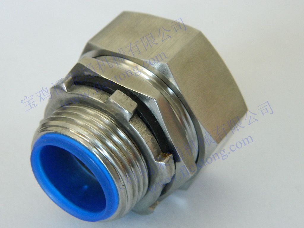 铜直接头带金属环的一端与金属软管连接,另一端螺纹连接穿线盒,开关箱,配电箱,电机等。